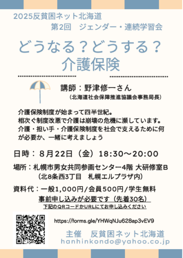 2009年に設立された反貧困ネット北海道では、生活相談や貧困問題に関する学習・啓発など様々な活動に取り組んできました。2020年は新型コロナウイルスの感染で活動が制約される中、反貧困ネット北海道を構成する諸団体(運営会員)が、それぞれの現場でどのような事態に直面しているのか、またそうした中でどのような活動に取り組んでおられるのか、共有することを目的に、連続学習会をオンラインで、6回にわたって開催してきました。事務局の責任でまとめた全記録は、反貧困ネット北海道のウェブサイトで読むことができます。