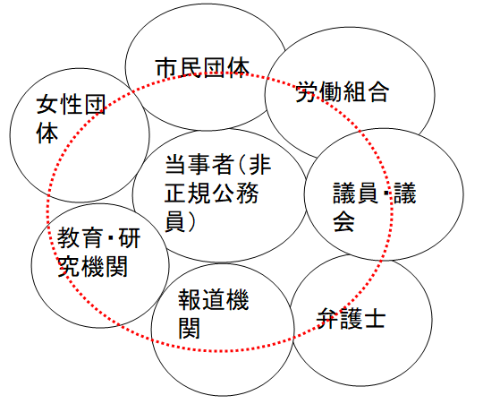 例えば、「我が方(わがほう)の議員」と労働組合から議員を紹介されることがあります。しかし、この非正規公務員問題を当該議員と当該労働組合とで本当に共有はできているでしょうか。また、仮にできているとして、共有するのは「我が方の議員」だけでよいのでしょうか。会派を超えて、自治体も超えて、議員とのつながりの強化が必要ではないでしょうか。あるいは、先のような優れた提言を出された労働弁護団(地域ブロック)と連繋はしているでしょうか。非正規公務員問題という複雑な問題について、報道機関にも理解を求めることはなされているでしょうか。支援者同士も、積極的に/自覚的に連繋を強化し、共同の実現を模索していきましょう。