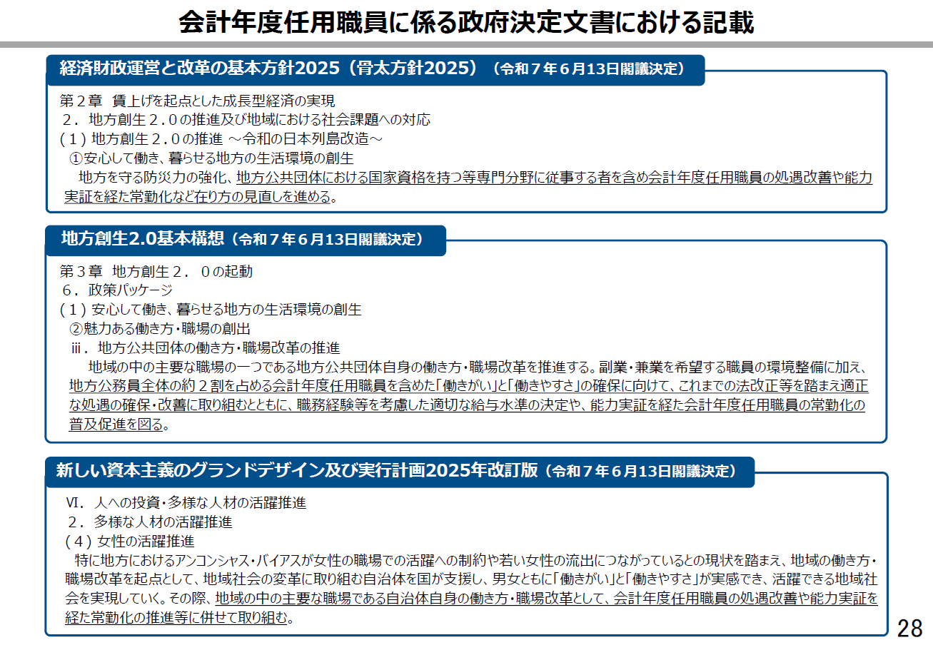 資料中にあるとおり、「骨太方針2025」、「地方創生2.0基本構想」、「新しい資本主義のグランドデザイン及び実行計画2025年改訂版」などの政府決定文書に、会計年度任用職員の「処遇改善」や「常勤化」といった記載があります。