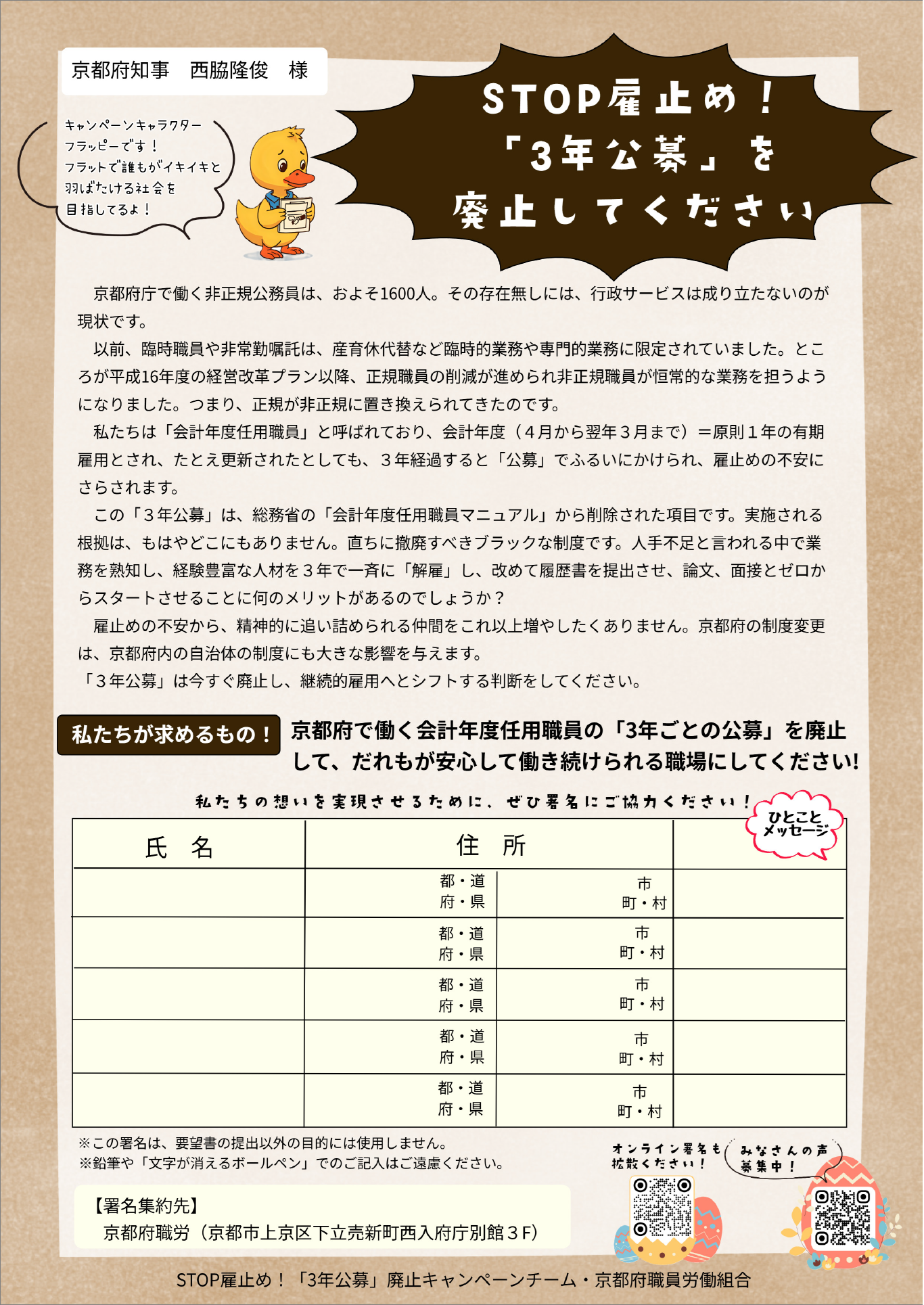 このオンライン署名をきっかけに、私たち非正規公務員のことを多くの方に知っていただきたいです。今までの経験や知識をないものにさせず、民間での無期転換を公務にも適用してほしい。ぜひ、力を貸してください。署名(上)をご家族、友人に広げてください。どうぞよろしくお願いします。