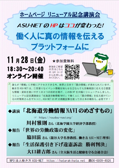 週末11月28日(金)に、大阪・関西の労働団体ASU-NET主催の企画で報告をします。