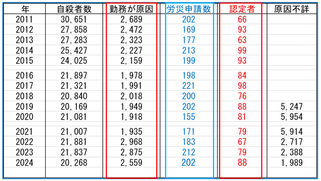 「勤務が原因」で自殺をされた方は2024年には2559人です。ところが労災申請は、そこから1割弱で、しかも認定をされるのは2桁の人数という厳しい状況です。国が認めた過労自死は氷山の一角であり、ほとんどの遺族は泣き寝入りしている状態です。なぜなら、申請者側に立証責任があるからです。