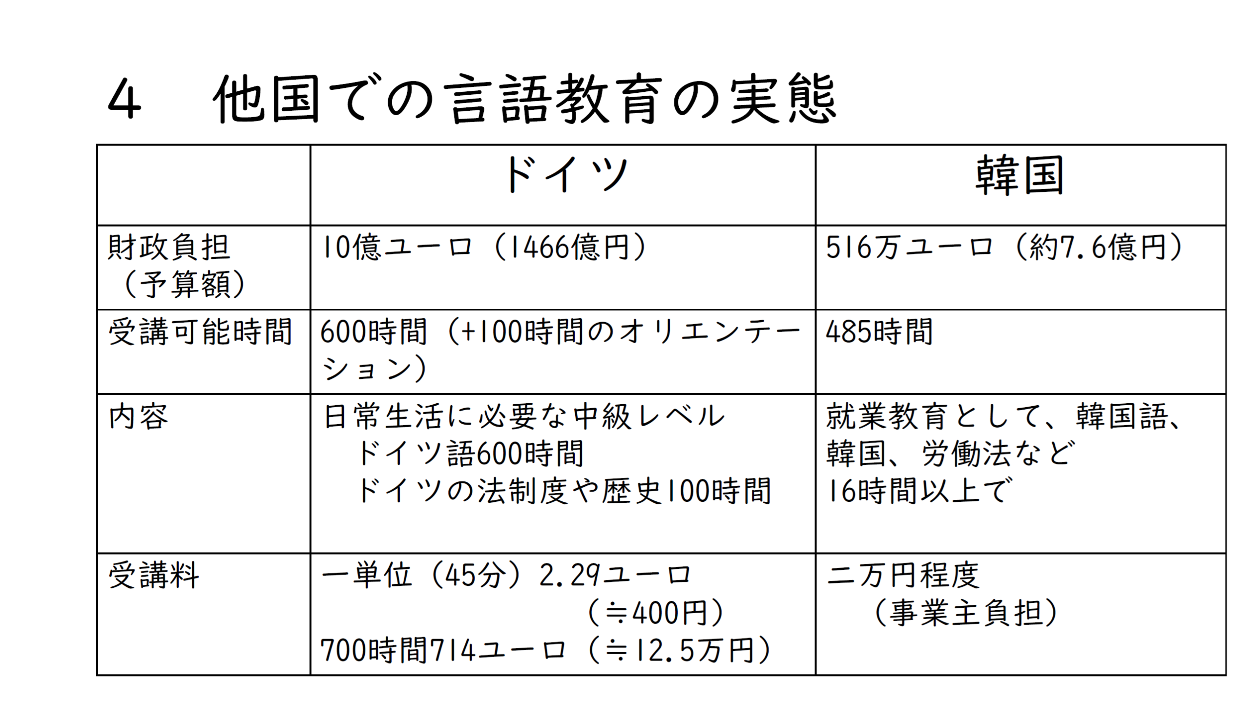 私がよく例にあげるのはドイツで、ドイツは、移民政策が進んでいます。予算も非常に大きいですし、受講可能な時間も非常に長いです。しかも、ドイツ語だけではなくて、法制度や歴史なども学ぶことができて、受講料は、一単位を計算したら400円くらいで、全時間である700時間を受けても12.5万円です。その上に、一定の条件を満たしたら──例えば、成績が良くてちゃんと修了をすれば、そのお金が後で返還される、という制度設計になっているようです。