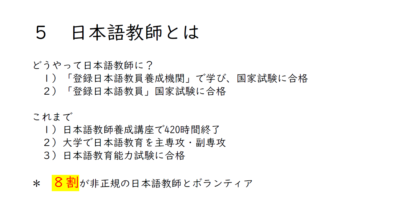 以上のように、日本語教師になるには幾つかのルートがあって、そして、今新しい制度ができたのですが、ここで声を大にして言いたいのは、日本語教師のうちの8割が、非正規の日本教師とボランティアから成り立っているということです。日本語教師、日本語教師と言われますが、そのほとんどは非正規で働いているか、ボランティアの人たちなんです。