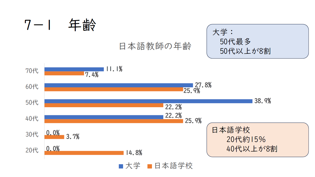 いろいろとみえてきた特徴の第一は、年齢の違いです。青いグラフは大学で働いている方で、オレンジが日本語学校で働いている方なんですけれども、大学の場合、50代が約4割と最多です。その次が60代で約3割です。70代の方もいらっしゃいます。以上を合計すると、50代以上が全体の8割を占めることになります。