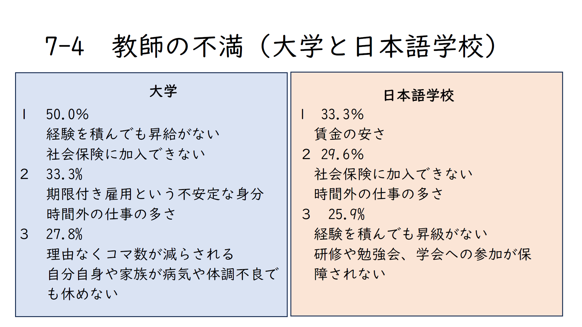 以上がまず、大学で働く先生たちの不満でしたが、次に、日本語学校で働く人たちはどうか。