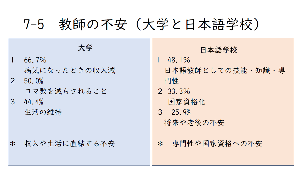 それに対して、日本語学校の先生の場合には、「日本語教師としての技能、知識、専門性」です。生活とはちょっとかけ離れた、仕事の専門性に関わる不安が大きいことがわかりました。