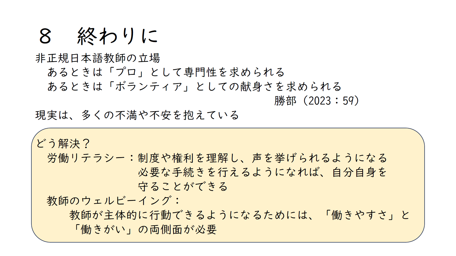 非正規の日本語教師の立場は、コロコロと都合よく見方が変えられると最近すごく感じています。参考文献にもあげた勝部美奈子さんという方は、こう書いています。あるときはプロとしての専門性を求められる。プロなんでしょう、日本語教師なんだからこのぐらいやってください、と言われる。その反面で、ボランティアとしての献身さもすごく求められる。学生のためにこのぐらいはやってくれるでしょうと。これはおそらく、日本語教師に限らず、学校の教員に少なからず共通することかと思いますが。