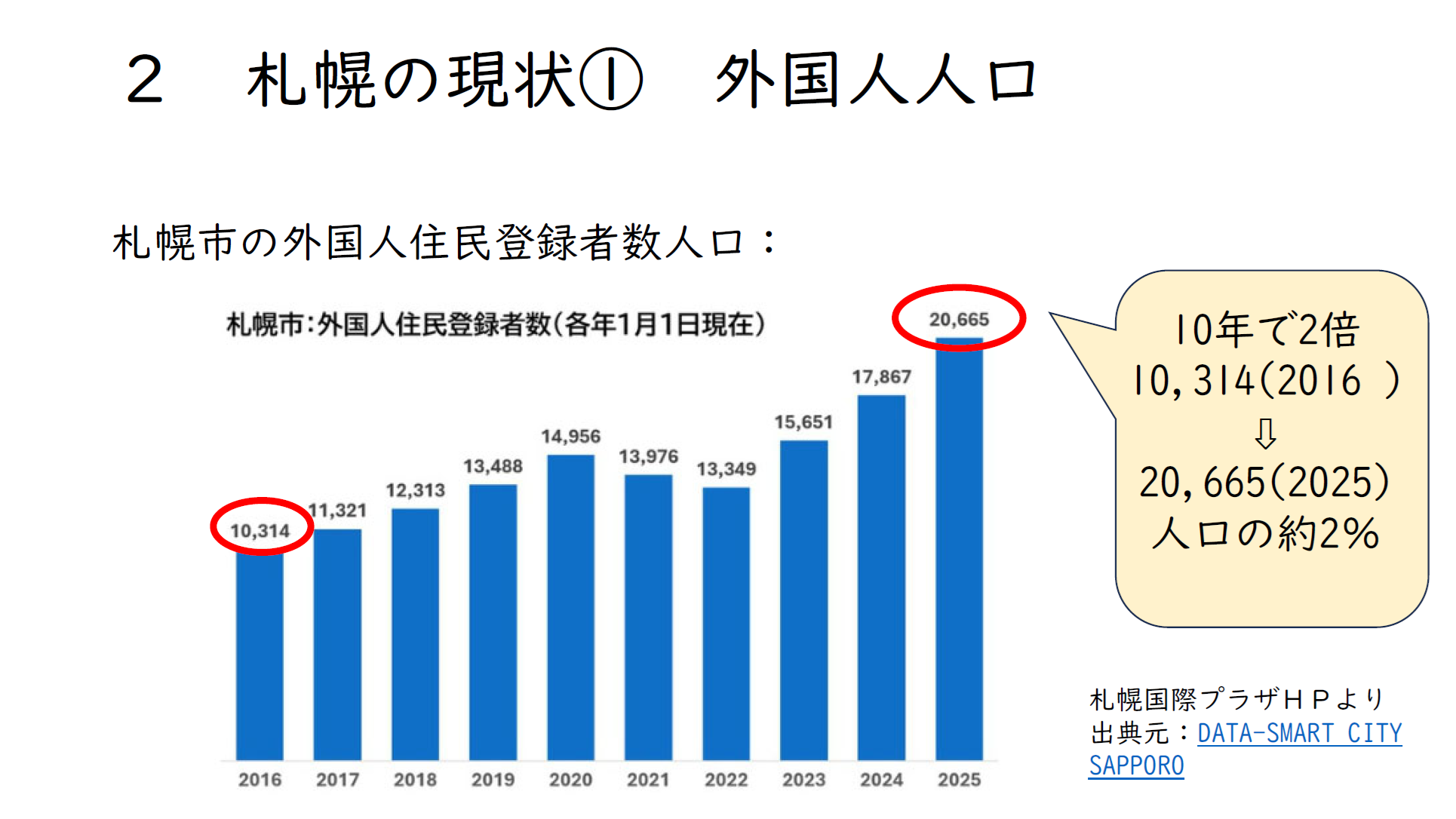 次に札幌の現状をみます。まず、外国人住民登録者数人口をみると、登録人数が毎年1月1日に更新されるのですが、今年(2025年)の1月現在で2万665人です。10年前に比べると2倍に増えています。