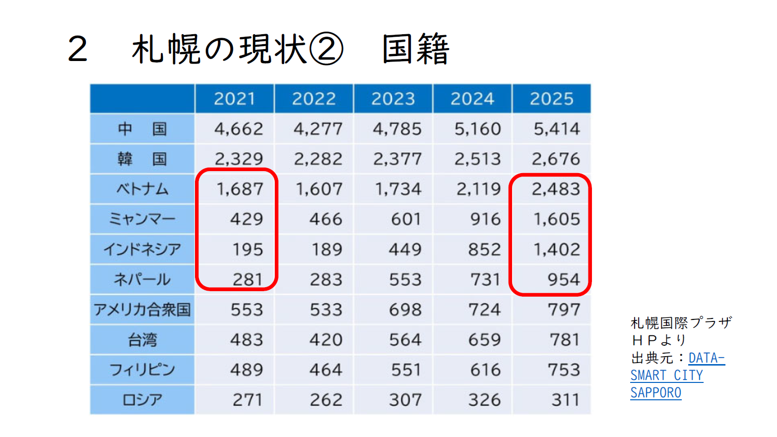では、札幌で暮らす外国人はどんな人たちなのかについて、まず国籍を取り上げます。これは、札幌国際プラザさんのホームページに掲載されたデータですが、国籍はすごく変化してきています。線で囲んだあたりが今すごく増えているところです。従来は、中国や韓国が常にトップ2でした。それが、ベトナムが韓国に追いつきそうなぐらいの勢いで増えていたり、政情の問題もありますけれども、ミャンマーの人たちがすごく増えてきたり、インドネシア、ネパールの人たちもすごく増えてきています。