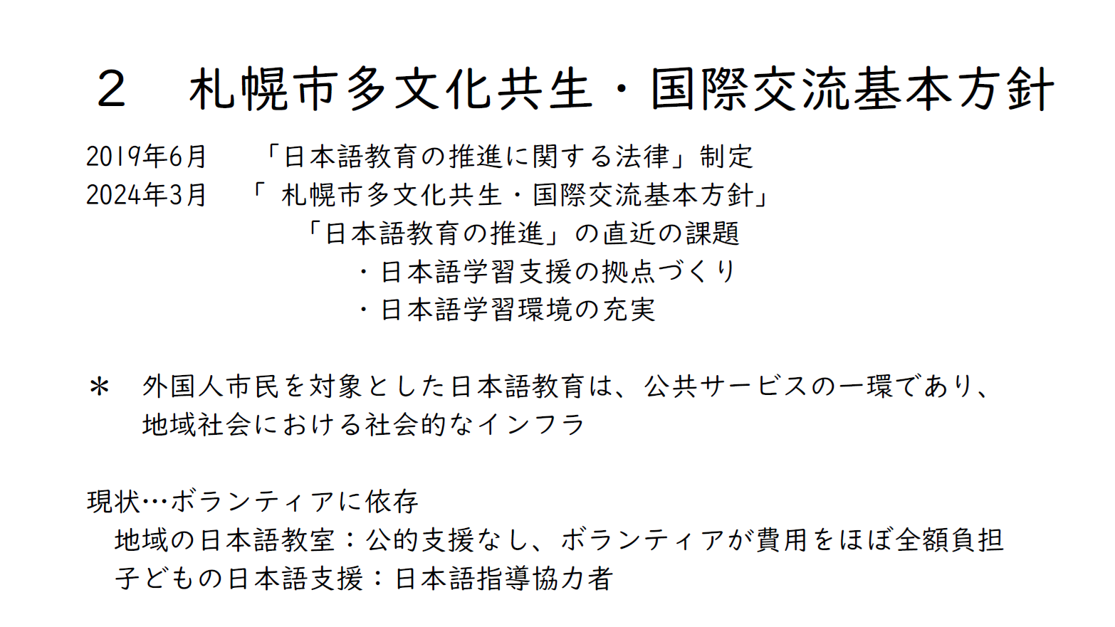 結局のところ、基本方針はちゃんと策定されているのですが、実態はどうかというと、やはりボランティアに依存している面が非常に大きいです。地域の日本語教室が札幌市内に、12~13ぐらいあるのですが、いずれにも、公的な支援はありません。