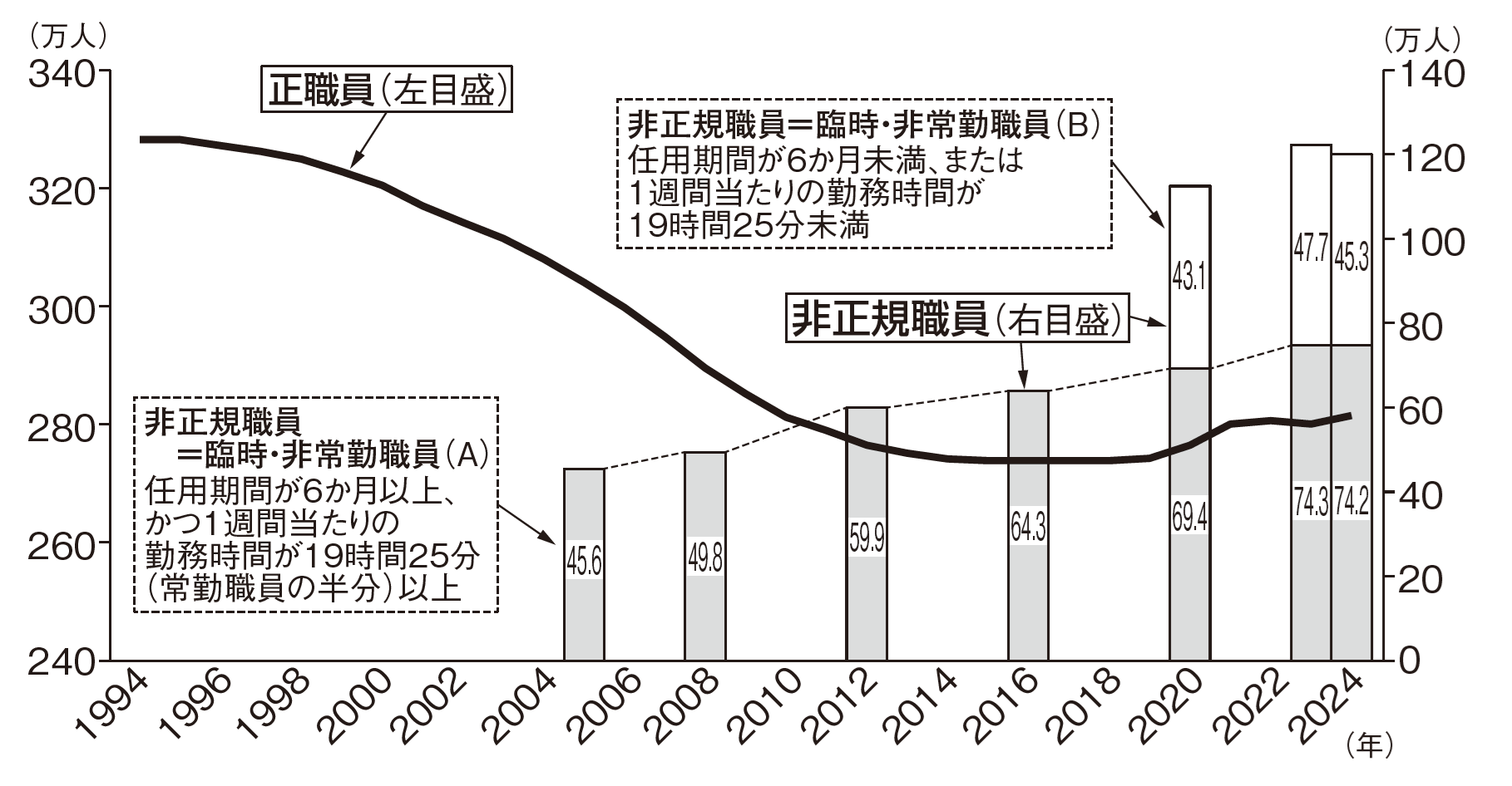 出所:総務省による調査(正職員は「地方公共団体定員管理調査」、非正規職員は不定期に行われる臨時・非常勤数の調査)より作成。