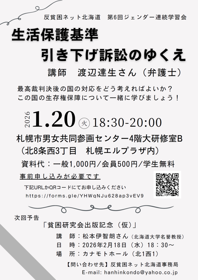 反貧困ネット北海道では、男女雇用機会均等法が制定されてから40年にあたる2025年度に、ジェンダーを軸にした連続学習会を開催しています。本稿は、2026年1月20日に開催された第6回学習会の記録です。