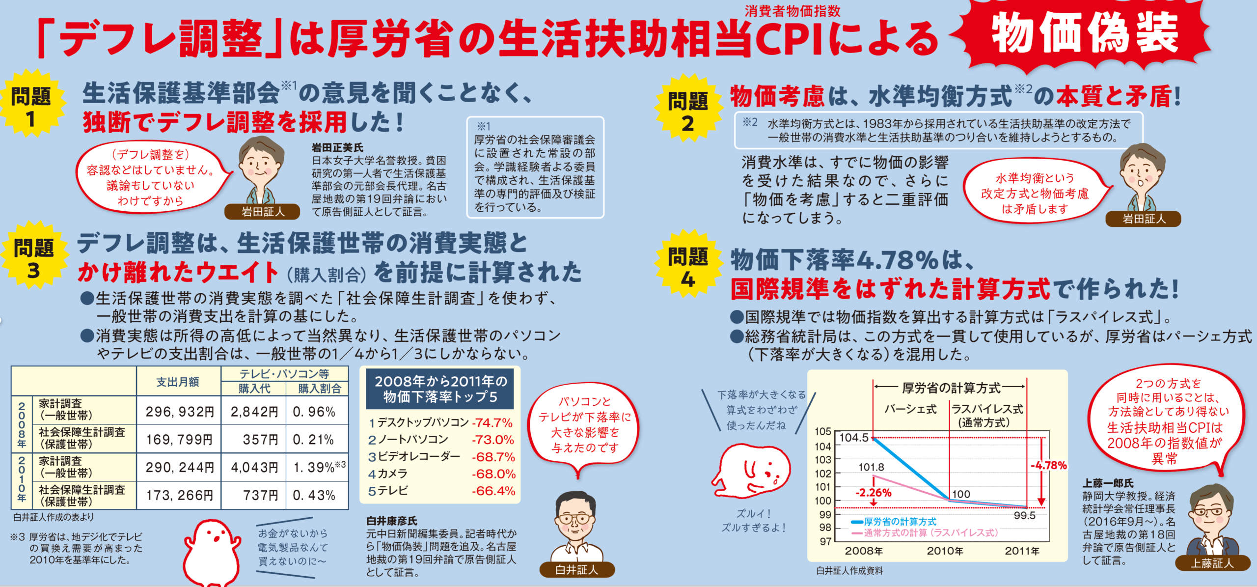 ちょうどこの時期は、地デジへの移行時期であったのですが、生活保護の利用者さんには地デジチューナーが支給されたりしているんです。ですから、生活保護の利用者さんが一般の方々と同じようにテレビを買い換えたという事実はないんです。それにも関わらず、そういった消費を前提にデフレ調整が行われている。それを物価偽装だと我々は指摘してきました。