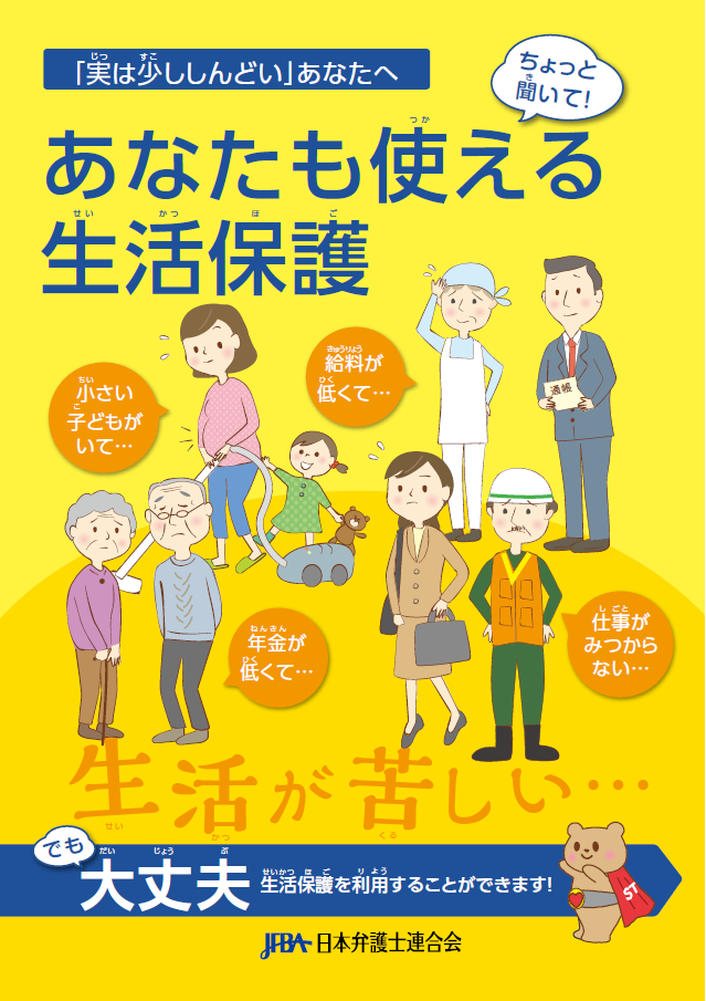 少し古いのですが、日弁連が作った「あなたも使える生活保護(2018年9月改訂)」という生活保護に関するパンフレット(以下、日弁連・生活保護パンフレット)を持ってきました。一般の方々には、生活保護という名前は知られていても、自分がもし生活に困窮したら使えるんだろうか、とか、内容は、十分かつ正確には、必ずしも理解されていないと思うんです。